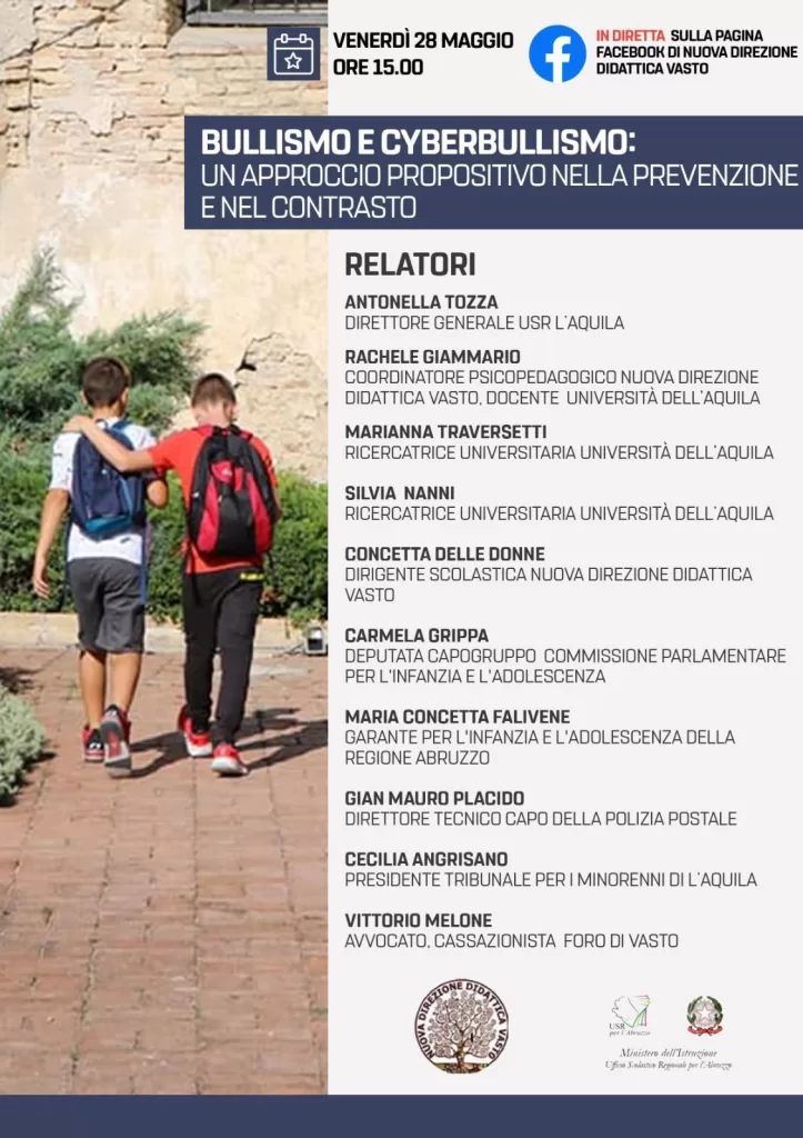 SEMINARIO: BULLISMO E CYBERBULLISMO: UN APPROCCIO PROPOSITIVO SEMINARIO IN DIRETTA FACEBOOK Di seguito il link per accedere alla pagina web della Commissione Parlamentare Infanzia e Adolescenza per chi volesse conoscere ulteriori dettagli del lavoro dell’Organismo. https://www.camera.it/leg18/1364?shadow_organo_parlamentare=3034&id_tipografico=36 Di seguito le slides dei relatori del seminario: “Linee guida per contrastare bullismo e cyberbullismo nelle scuole abruzzesi” – […]